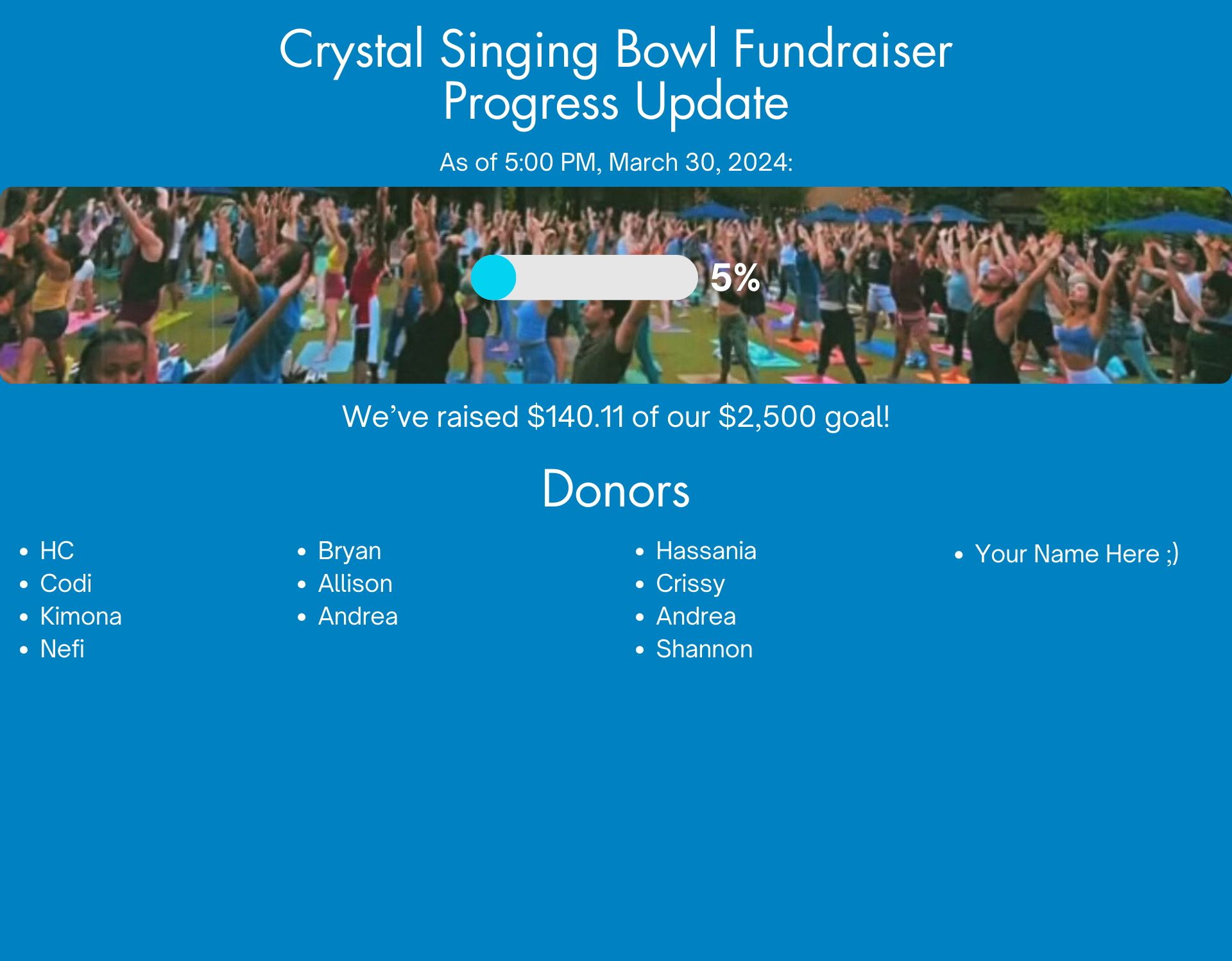 I’m raising funds to purchase Crystal Singing Bowls, instruments that harness sound vibrations to deepen relaxation, restore balance, and enhance meditation. With your support, I can integrate these bowls into future yoga and mindfulness sessions, creating a richer, more immersive healing experience for the community.